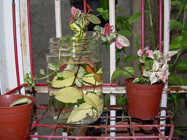 混合種在一起又是另外一種風情,這種花很好種,我窗外這種橙黃色的品種原先是種在我窗戶的左邊釣起來的都不開花,因為陽光照不到一直徒長,後來我把它全丟掉,過程中掉了一根在窗下,那時後還沒有這個長條型花盆,所以我找不到理由必需爬到窗外去撿它,後來做了這個花盆才看到它還在就把它插上去,這時後它已經是在窗下躺了近2個禮拜了,烈日這麼大都還曬不死它,而且它是掉在鐵皮屋上有多熱你可以想像一下