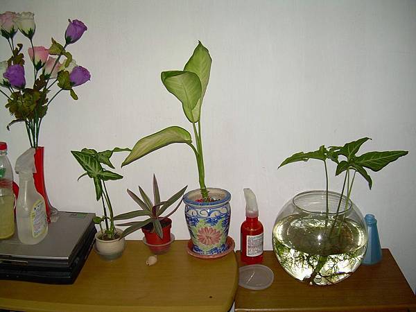 混合種在一起又是另外一種風情,這種花很好種,我窗外這種橙黃色的品種原先是種在我窗戶的左邊釣起來的都不開花,因為陽光照不到一直徒長,後來我把它全丟掉,過程中掉了一根在窗下,那時後還沒有這個長條型花盆,所以我找不到理由必需爬到窗外去撿它,後來做了這個花盆才看到它還在就把它插上去,這時後它已經是在窗下躺了近2個禮拜了,烈日這麼大都還曬不死它,而且它是掉在鐵皮屋上有多熱你可以想像一下